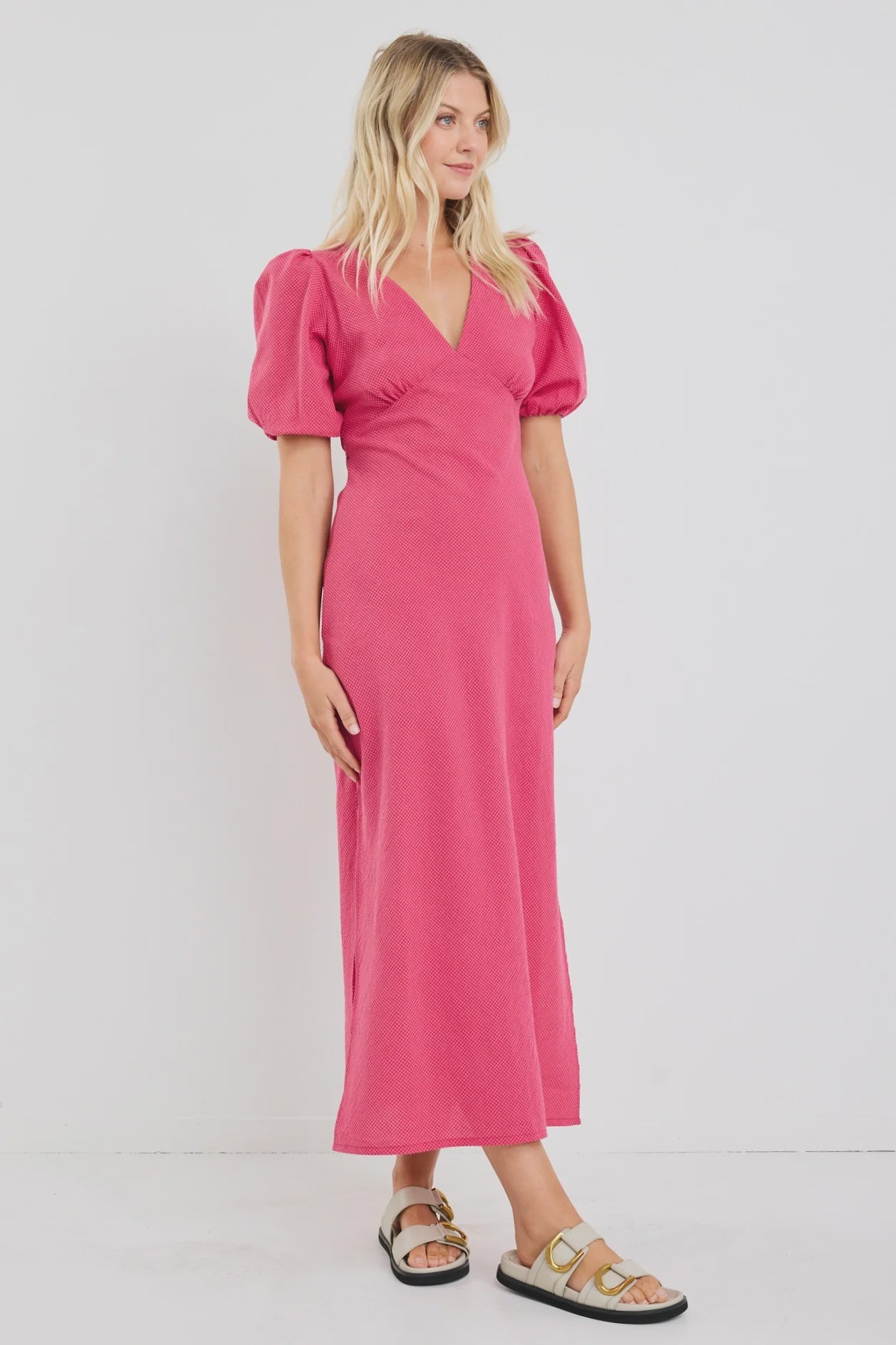 Amora Raspberry Ditsy Gingham SS Bias Midi Dress