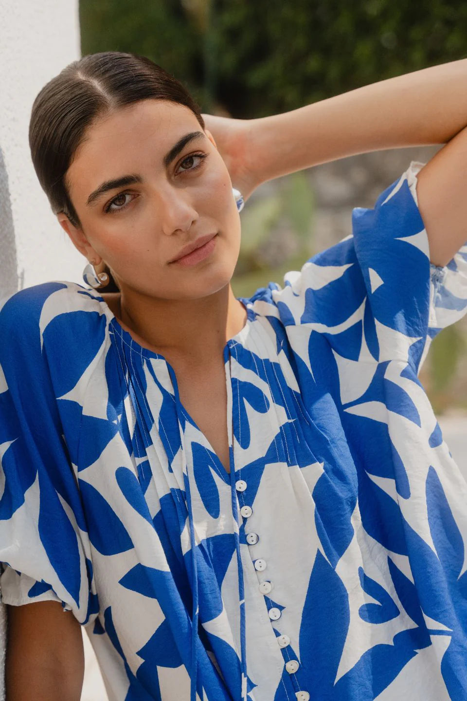 Bold, breezy and full of personality the Antic blue abstract top from Among The Brave makes every outfit pop. Featuring an eye-catching abstract print and soft short sleeves with gentle gathers, this relaxed style brings playful sophistication to your wardrobe. Made from a luxe lyocell-nylon blend, it feels silky smooth and light, making it perfect for cross-seasonal layering and easy high-low dressing.