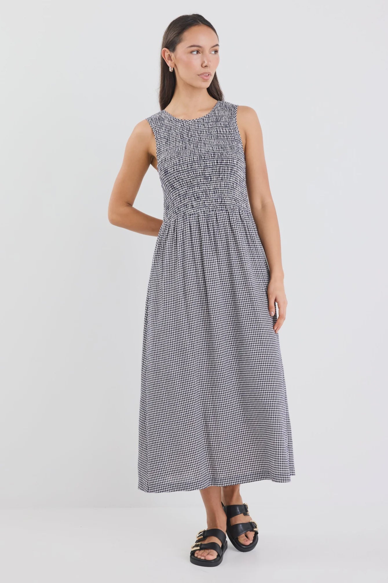 Effortlessly charming, the Bryar Midi Dress is the ultimate throw-on-and-go piece. Designed in a classic navy mini gingham, it features a shirred bodice that flatters while offering plenty of stretch and comfort. The sleeveless cut and crew neckline keep it simple and polished, while the natural fibre blend gives it a light, breathable feel.
