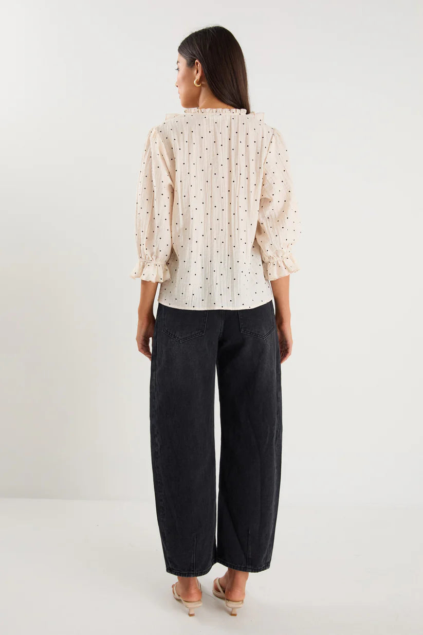 The Garnish top is all about effortless charm with a playful edge. Designed with soft mid sleeves and a button front, it features a delicate ruffle trim and tie detail that brings a touch of romance. The cream base with black spots keeps it timeless yet fun, while the lightweight fabric blend drapes beautifully.