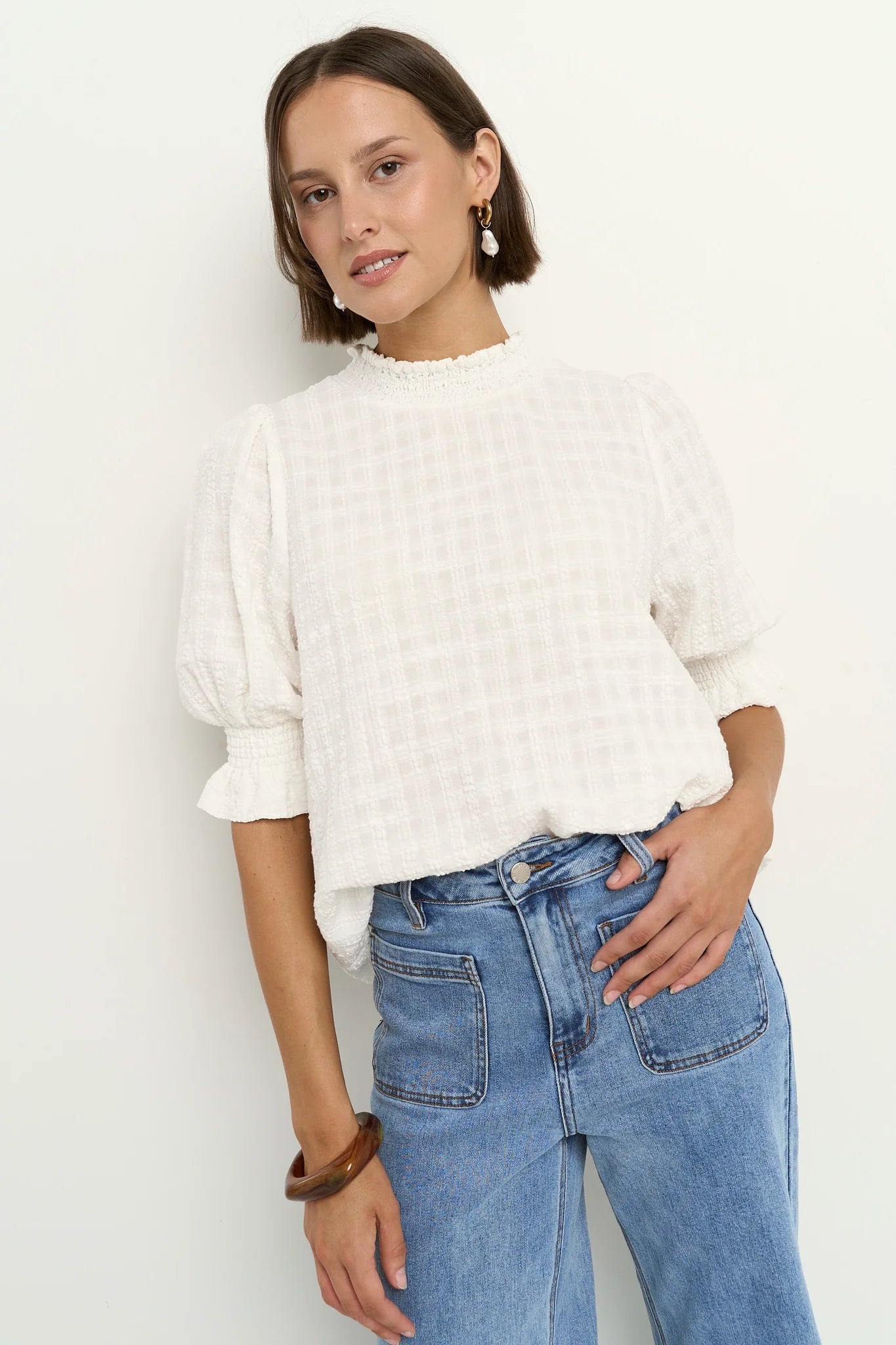 From the office to dinner the Influential Ivory Shirred Neck Top from Among the Brave is a versatile staple you need in your wardrobe. With a high shirred neckline and mid-length balloon sleeves this top pairs perfectly with high waisted jeans or dress it up with a slip skirt.