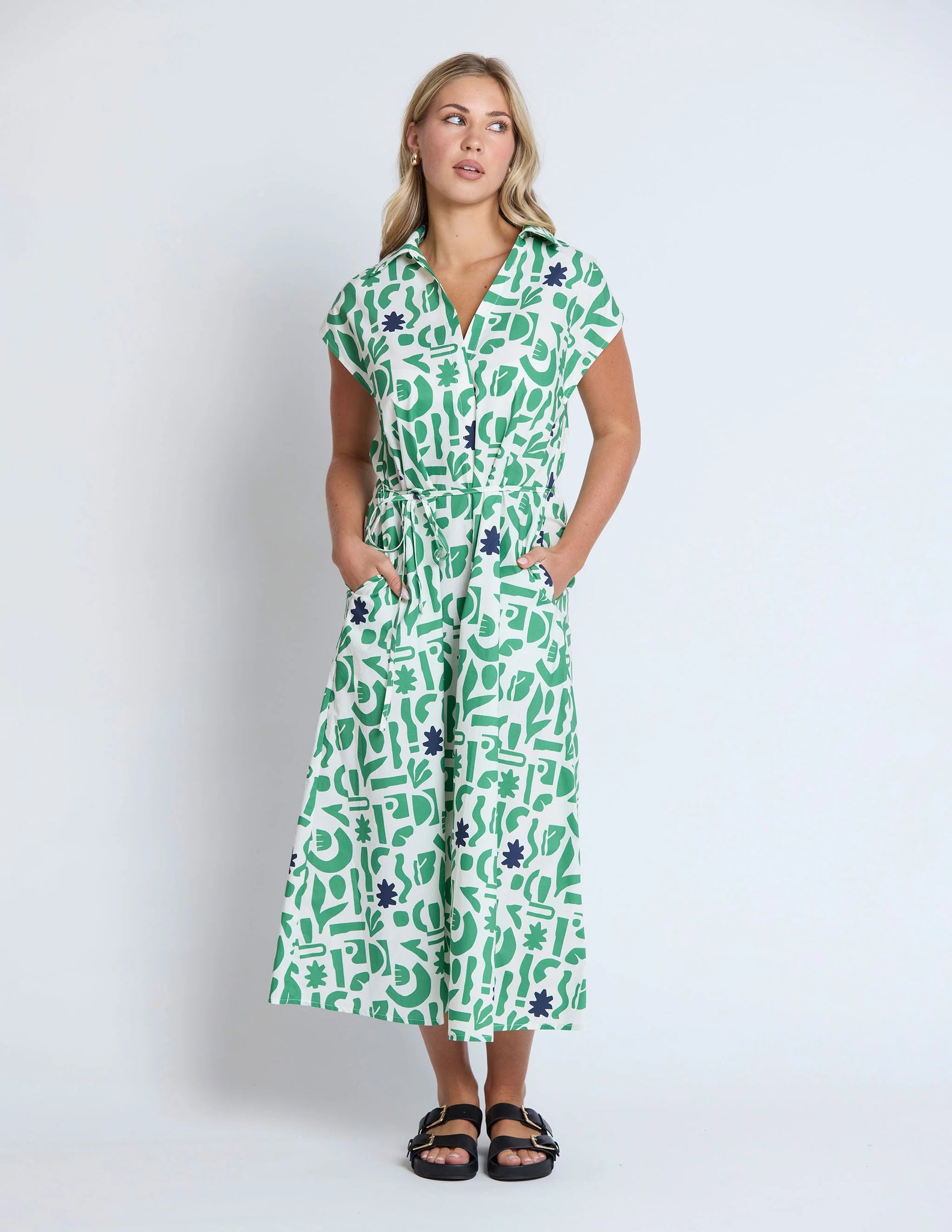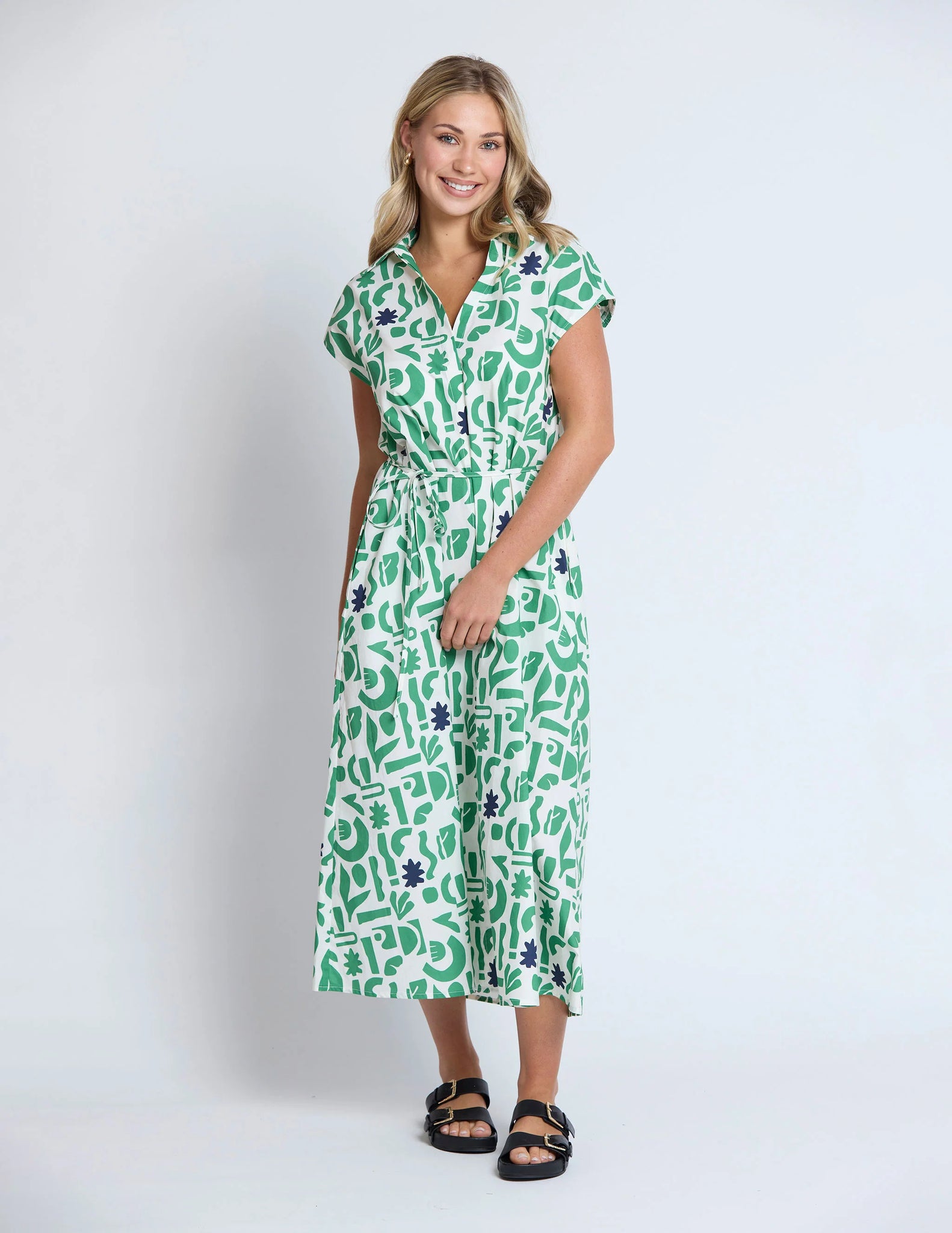 Midi cap sleeve dress with concealed placket button front, open collar neckline, side pockets and self fabric narrow width tie belt