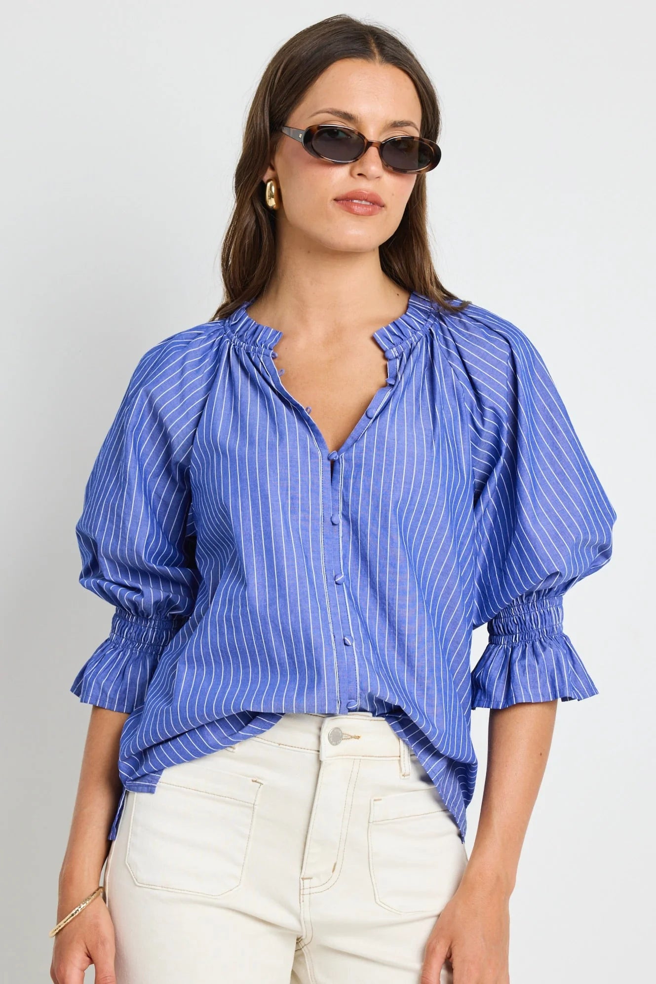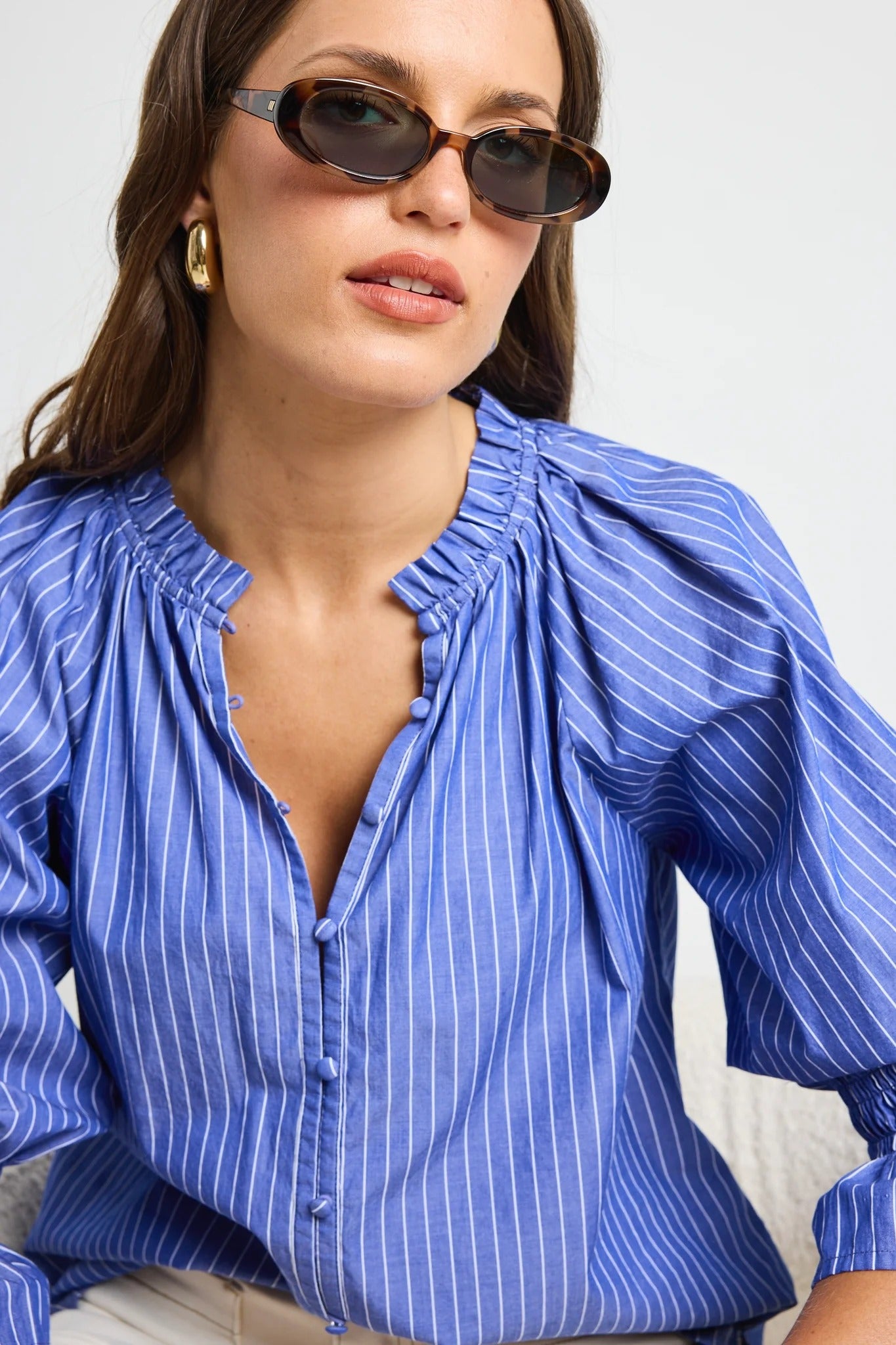 This playful blouse is perfect for any occasion, featuring a stunning elastic puff sleeve and frill neckline. This light weigth striped blouse is the perfect way to elevate your everyday look.