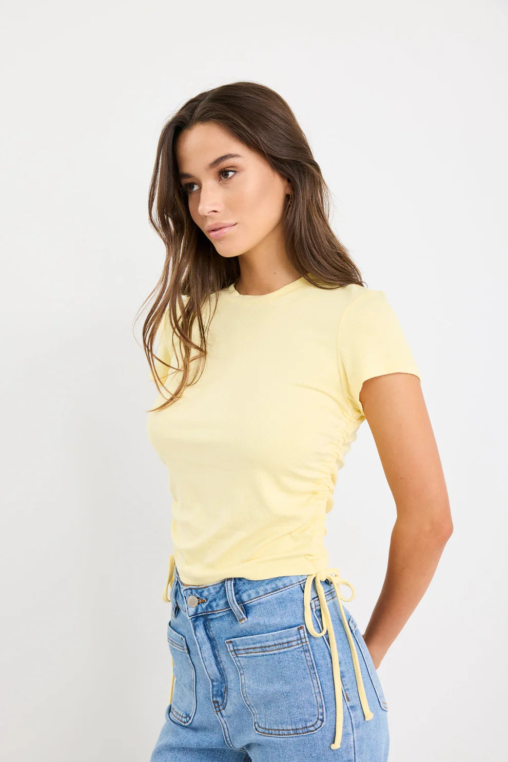 The Perfect Cream Tee brings a fresh twist to a wardrobe staple, with ruched side ties that let you customise the fit and shape. Crafted in a soft ribbed fabric with just the right amount of stretch, it's designed to hug your curves and move with you through every part of your day. A timeless piece with a modern edge.