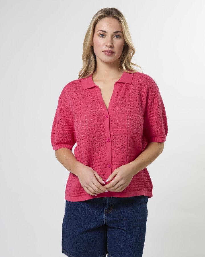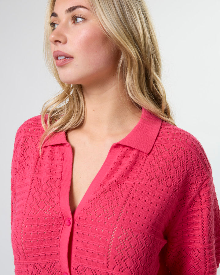 Short sleeve button front collared cardigan in pointelle knit