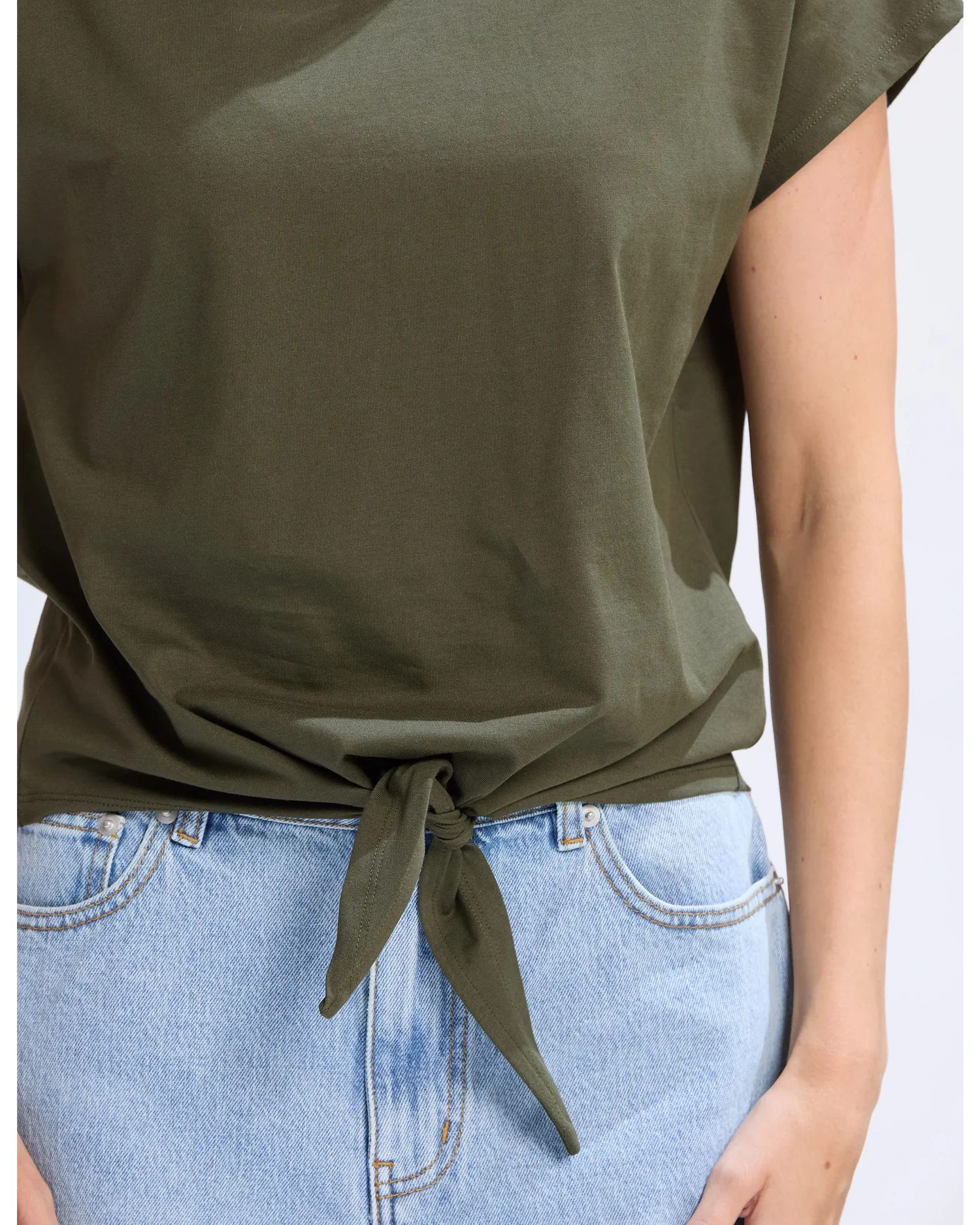 Elevate your everyday essentials with this effortlessly stylish crew neck tee. Designed with flattering cap sleeves and a soft, relaxed fit, this top features a front knot tie detail that adds a playful twist to a classic silhouette.